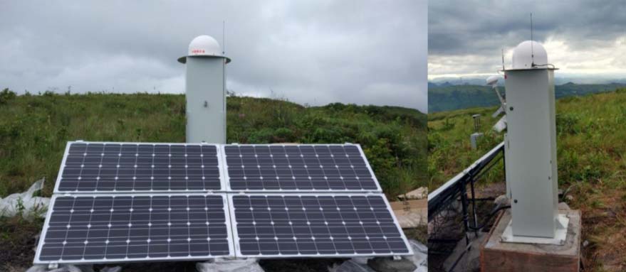 方式一:在北斗监测点以外的山体基岩上,或变电站、配电所的楼顶,或电力铁塔上安装北斗基准站。展示的是在山体基岩上设置的基准站。基准站坐标已知,并长期保持稳定。基准站接收北斗卫星数据,并通过电台或4G通信模块将差分数据发送至导线上的北斗监测点装置,供差分定位解算,以得到导线的高精度坐标。基准站采用太阳能供电,配备200Ah磷酸铁锂蓄电池,和400W太阳能板,以保证在连续阴雨情况下,可持续20以上天稳定供电。