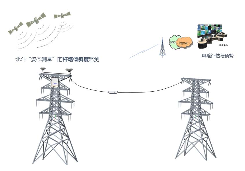 ——采用“北斗三代姿态测量技术”测量电力铁塔的倾斜度,实现24小时全天候实时监测,测量精度可达0.0065%(基线长度2-5米)。