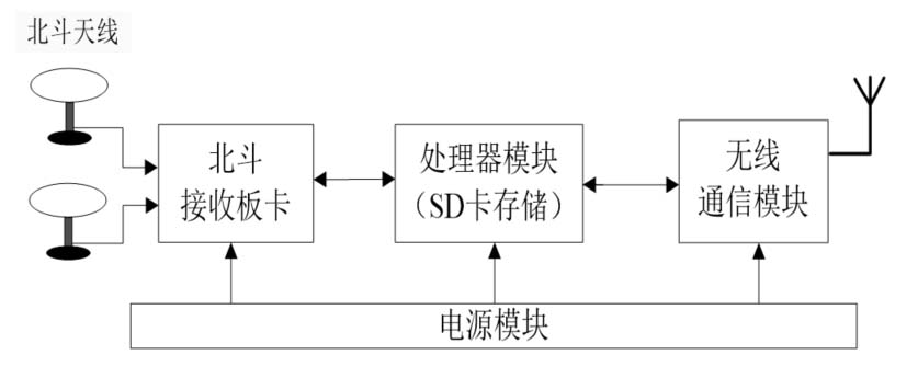 自主研制的北斗接收设备的硬件设计框图如图1所示,主要包含四个功能模块:北斗接收板卡、处理器模块、无线通信模块和电源模块,可以实现对卫星原始观测数据的采集、分析和传输等功能。北斗接收设备实物图如图2所示。