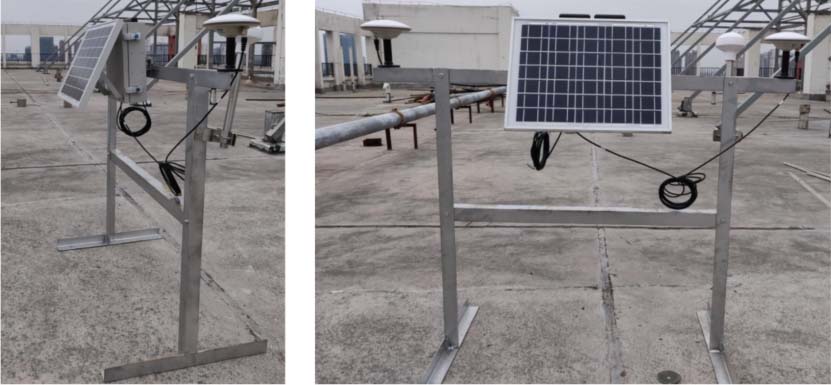 监测点设备由北斗天线和北斗接收设备两部分组成。在电力铁塔的顶端安装两个北斗天线。北斗天线与北斗接收设备相连。北斗天线接收卫星信号,接收设备将“载波相位”等原始观测数据,通过无线公网/北斗短报文发送到云监控平台,用于解算基线L姿态方程获得基线L的姿态角,进而求得电力铁塔的倾斜度。监测点设备采用太阳能电池板和蓄电池进行供电。