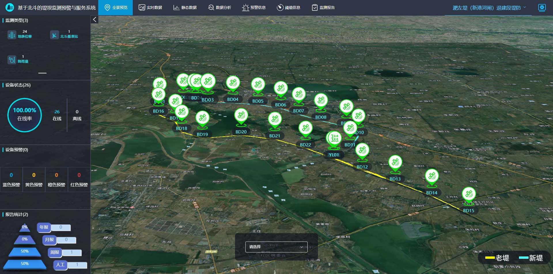 在防洪坝体以外的地势稳定区域,安装北斗基准站。如图展示的是设置在稳定区域的基准站。基准站坐标已知,并长期保持稳定。基准站接收北斗卫星数据,并通过电台或LoRa通信模块将差分数据发送至北斗监测点装置,供差分定位解算,以得到导线的高精度坐标。基准站采用市电供电或者太阳能供电的方式。采用太阳能供电时,配备200Ah磷酸铁锂蓄电池,和400W太阳能板,以保证在连续阴雨情况下,可持续30以上天稳定供电。